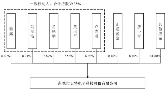 截至本公告日,贝特电子无控股股东,股东韩露、刘汉浩、易鹏举、黄卫平及卢志明签署了《一致行动协议》,合计持有贝特电子39.35%股份,为贝特电子实际控制人。