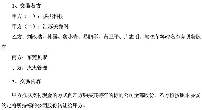 根据交易各方签署的《股份转让协议》, 本次交易中提供业绩承诺的贝特电子股东将共同出资成立持股平台东莞贝聚,由东莞贝聚通过大宗交易的方式从上市公司扬杰电子控制的建水县杰杰管理受让不低于7.16亿元交易金额的扬杰科技股票并将取得的扬杰科技股票全部质押给扬杰科技全资子公司江苏美微科,并自愿锁定至2028年6月30日以作为业绩承诺的履约保障。