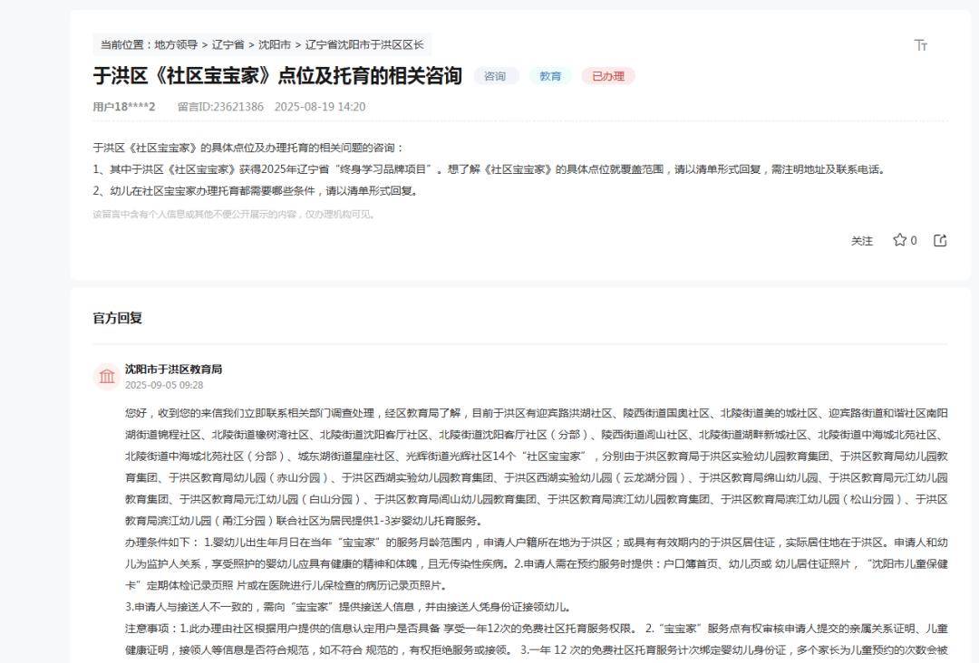 1、其中于洪区《社区宝宝家》获得2025年辽宁省“终身学习品牌项目”。想了解《社区宝宝家》的具体点位和覆盖范围,请以清单形式回复,需注明地址及联系电线、幼儿在社区宝宝家办理托育都需要哪些条件,请以清单形式回复。