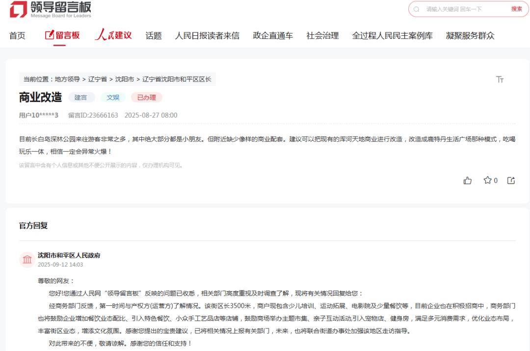 问:目前长白岛深林公园来往游客非常之多,其中绝大部分都是小朋友。但附近缺少像样的商业配套。建议可以把现有的浑河天地商业进行改造,改造成鹿特丹生活广场那种模式,吃喝玩乐一体,相信一定会异常火爆!