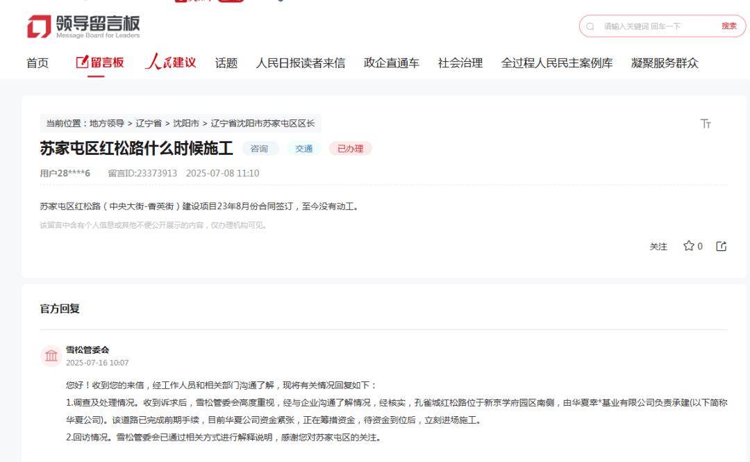 答:1.调查及处理情况。收到诉求后,雪松管委会高度重视,经与企业沟通了解情况,经核实,孔雀城红松路位于新京学府园区南侧,由华夏幸*基业有限公司负责承建(以下简称华夏公司)。该道路已完成前期手续,目前华夏公司资金紧张,正在筹措资金,待资金到位后,立刻进场施工。