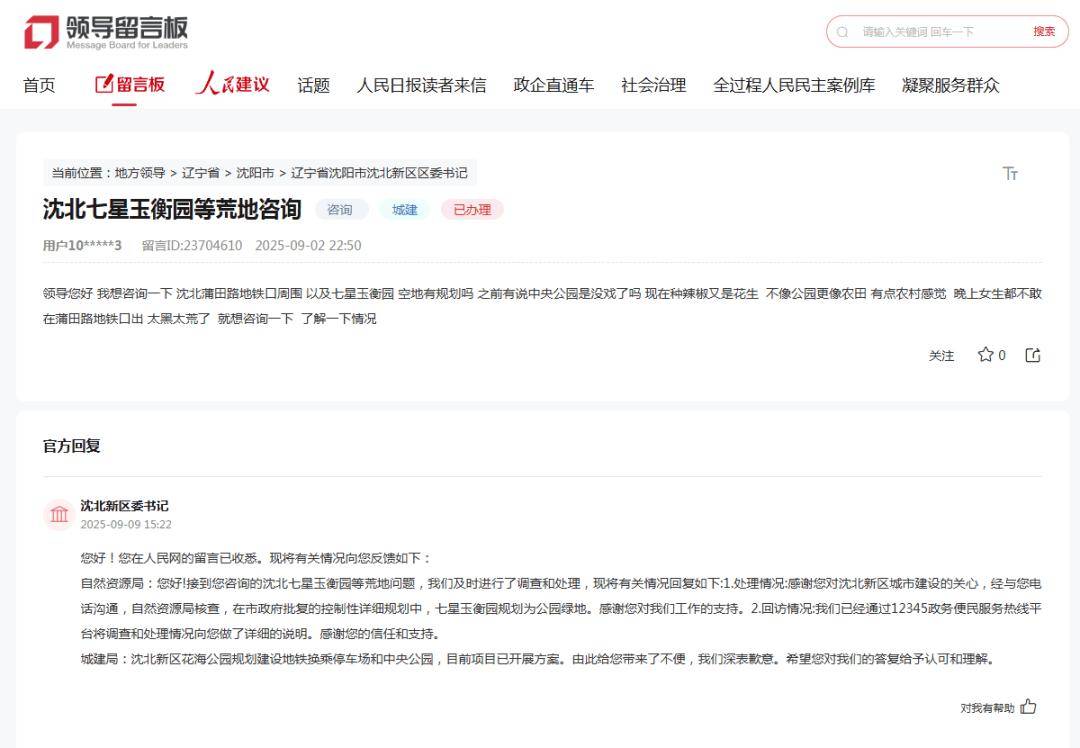 答:自然资源局:您好!接到您咨询的沈北七星玉衡园等荒地问题,我们及时进行了调查和处理,现将有关情况回复如下:1.处理情况:感谢您对沈北新区城市建设的关心,经与您电话沟通,自然资源局核查,在市政府批复的控制性详细规划中,七星玉衡园规划为公园绿地。感谢您对我们工作的支持。2.回访情况:我们已经通过12345政务便民服务热线平台将调查和处理情况向您做了详细的说明。感谢您的信任和支持。
